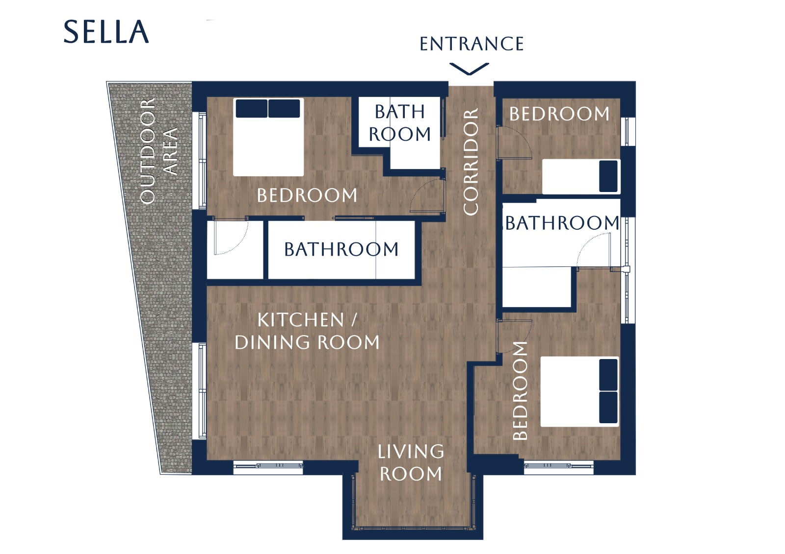 85 m² 3 camere (2 kings), ognuna con il proprio bagno Appartamento accessibile a persone con mobilità ridotta Vedi la planimetria